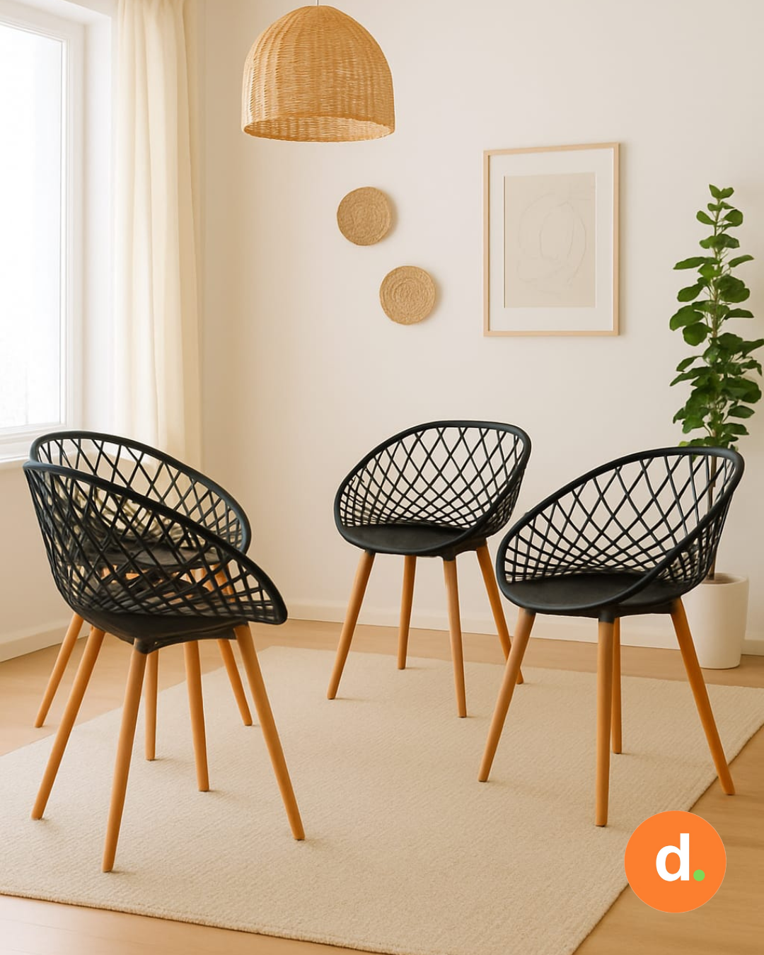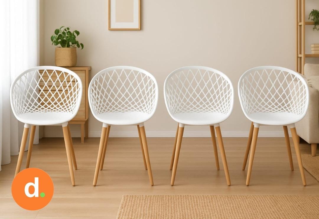 Sillas de diseño moderno con asiento de polipropileno blanco o negro y respaldo calado estilo rejilla, que combina estética y comodidad. Sus patas aportan calidez y estabilidad, creando un equilibrio perfecto entre lo contemporáneo y lo natural. Ideales para cocinas, comedores o espacios luminosos, aportando un toque acogedor y elegante.