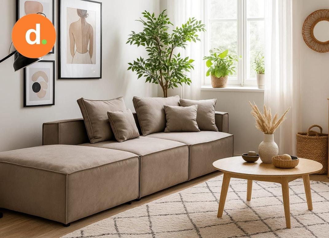 Un diseño versátil y moderno que se adapta a tu espacio y estilo. Compuesto por 3 módulos independientes con delicados detalles en costuras y brazos rectos, este sofá ofrece múltiples configuraciones: desde un amplio sofá esquinero hasta un cómodo sillón con puff.