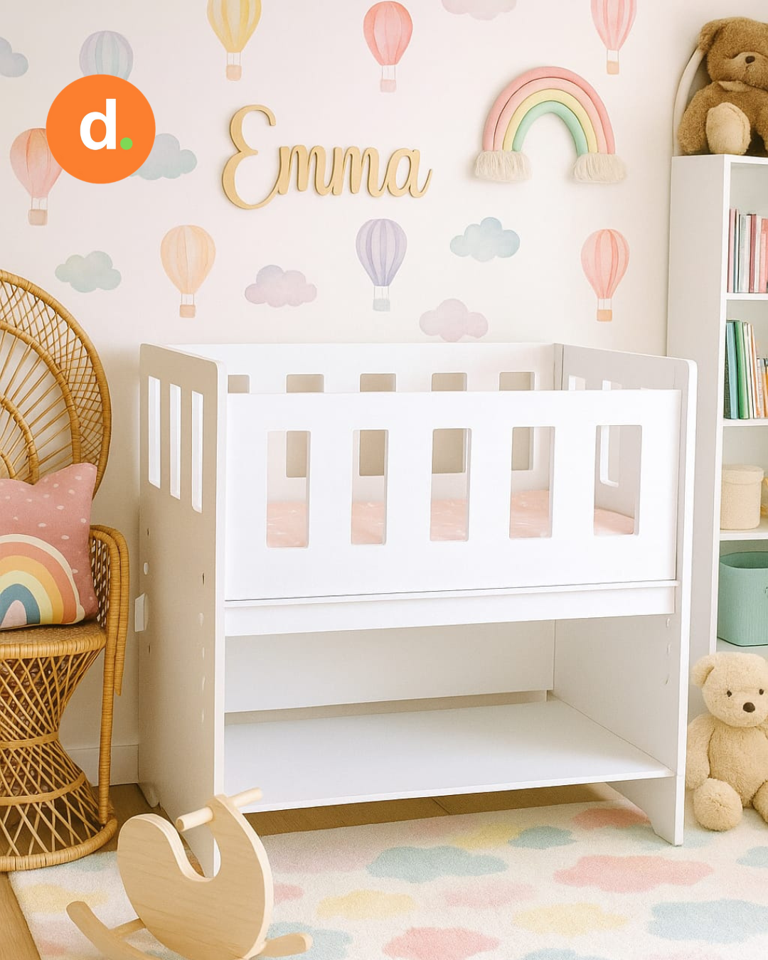 Su diseño permite utilizarla junto a la cama de los padres para un descanso tranquilo y cercano durante la noche. Además, cuenta con estante inferior ideal para guardar pañales, mantas, juguetes o accesorios del bebé, manteniendo todo siempre a mano.