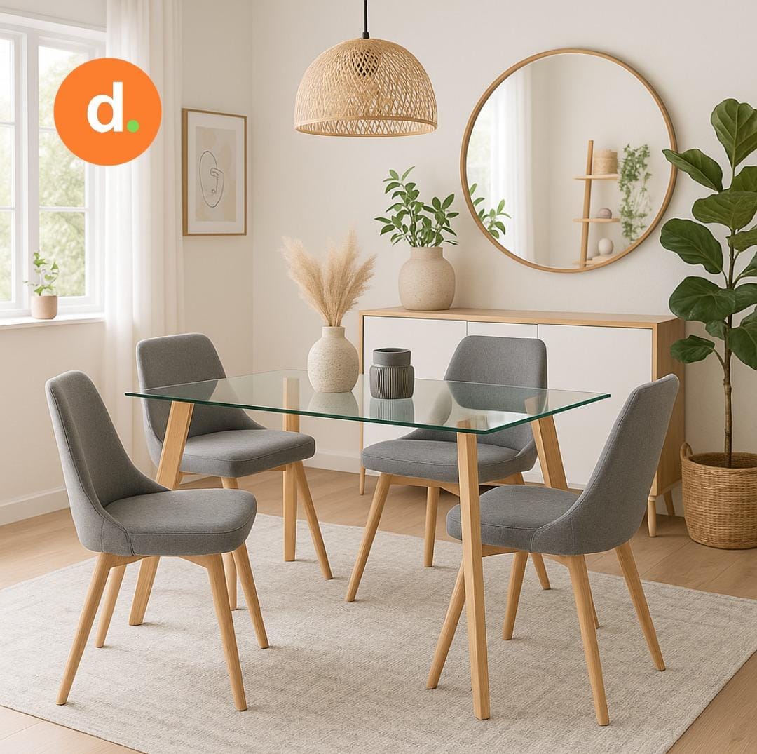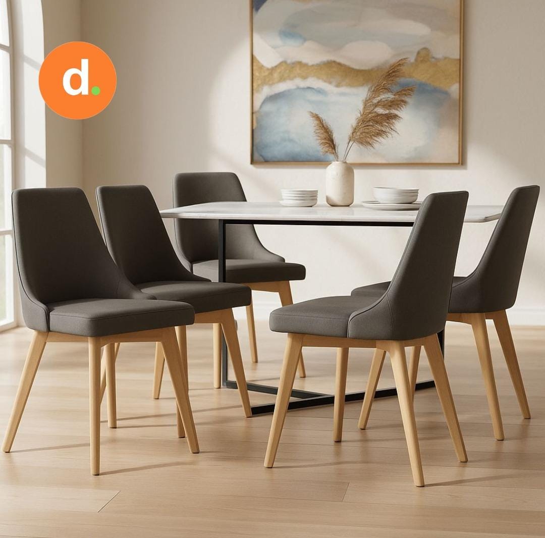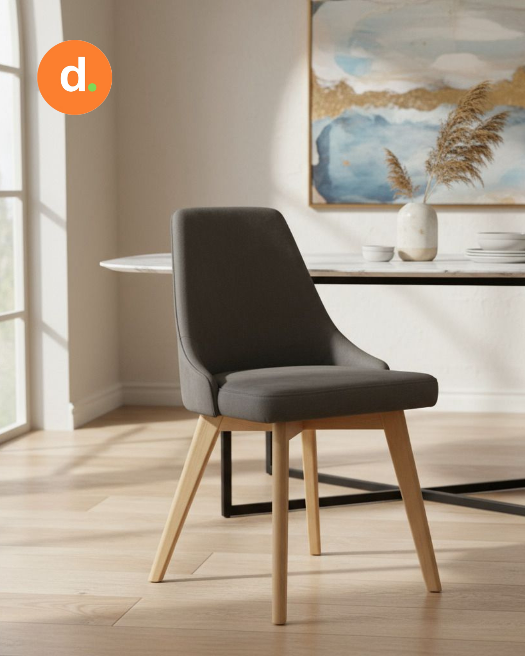 Sillas modernas con diseño escandinavo, ideales para comedores o espacios de trabajo. Su asiento tapizado en tela gris suave brinda una comodidad superior, mientras que las patas de madera clara aportan calidez y estilo natural. Combinan a la perfección con ambientes luminosos, minimalistas o nórdicos.