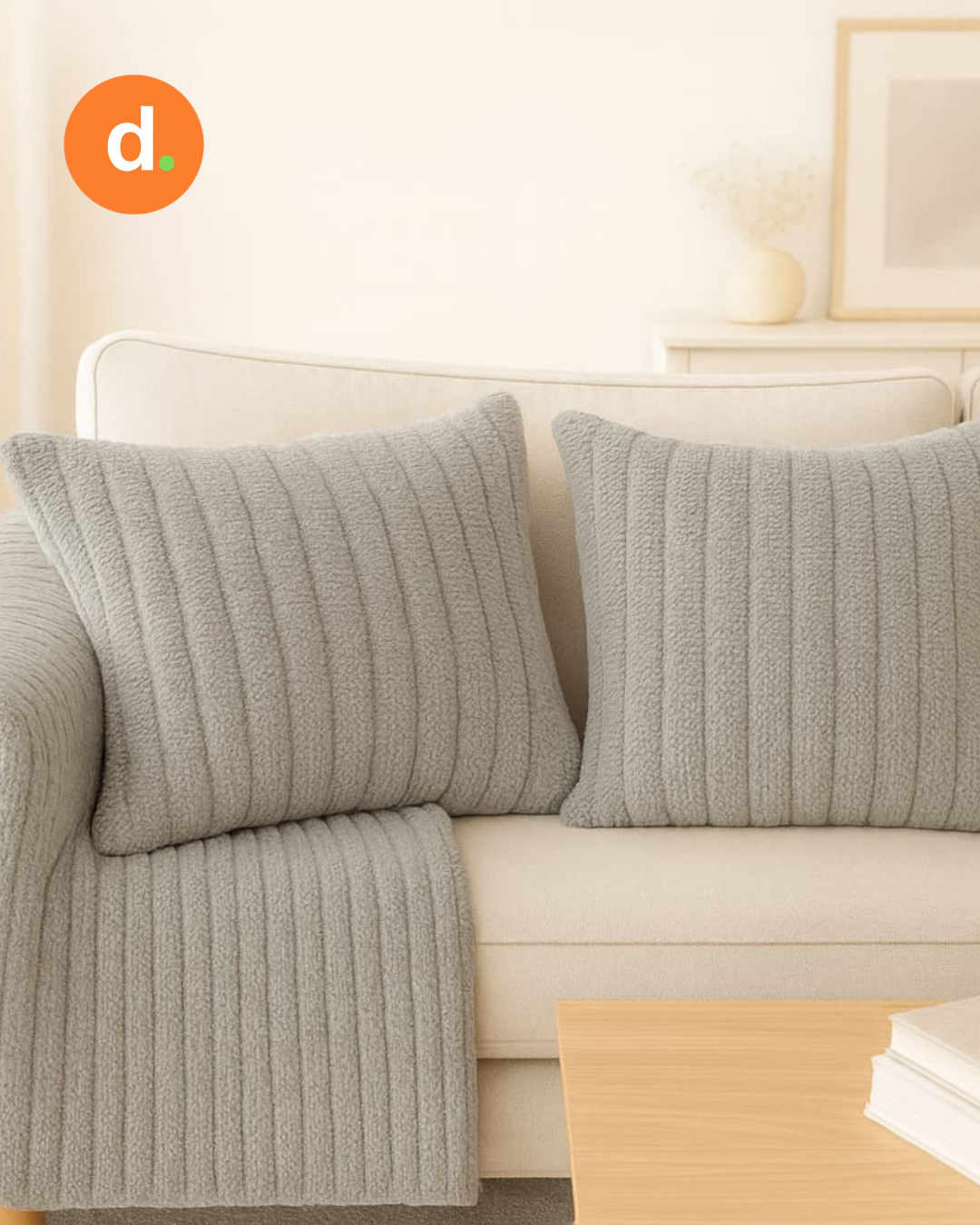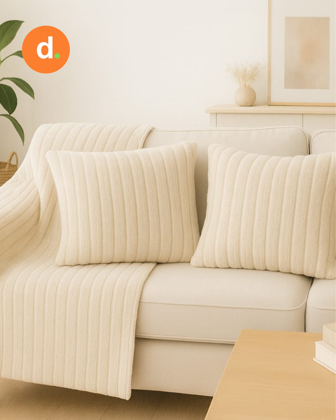 Transformá tu living con este set súper suave y elegante. El juego incluye una manta y dos almohadones, diseñados con una textura acanalada de que aporta calidez, estilo y un look moderno a cualquier ambiente.